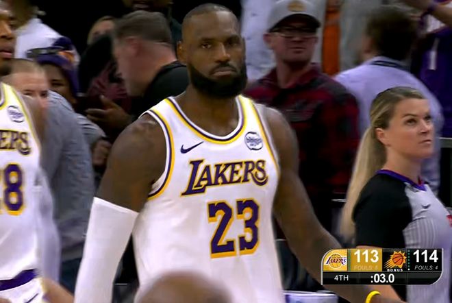 此时詹姆斯竟然没有罚进技术犯规,罚球投丢还是113-114落后1分,结果给球权之后,裁判一看第一次保送保送不了,又给出了第二次保送。东契奇最后时刻压哨跳起传球詹皇,詹姆斯顶着布克的防守选择强行投三分,结果最终球没进又被裁判吹了犯规,再给他三个罚球,时间还剩3秒。